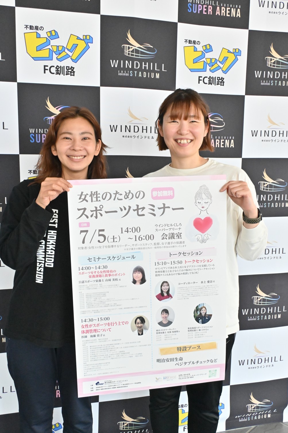 [写真/「女性のためのスポーツセミナー」の聴講を呼び掛ける水上さん(右)と楠さん]