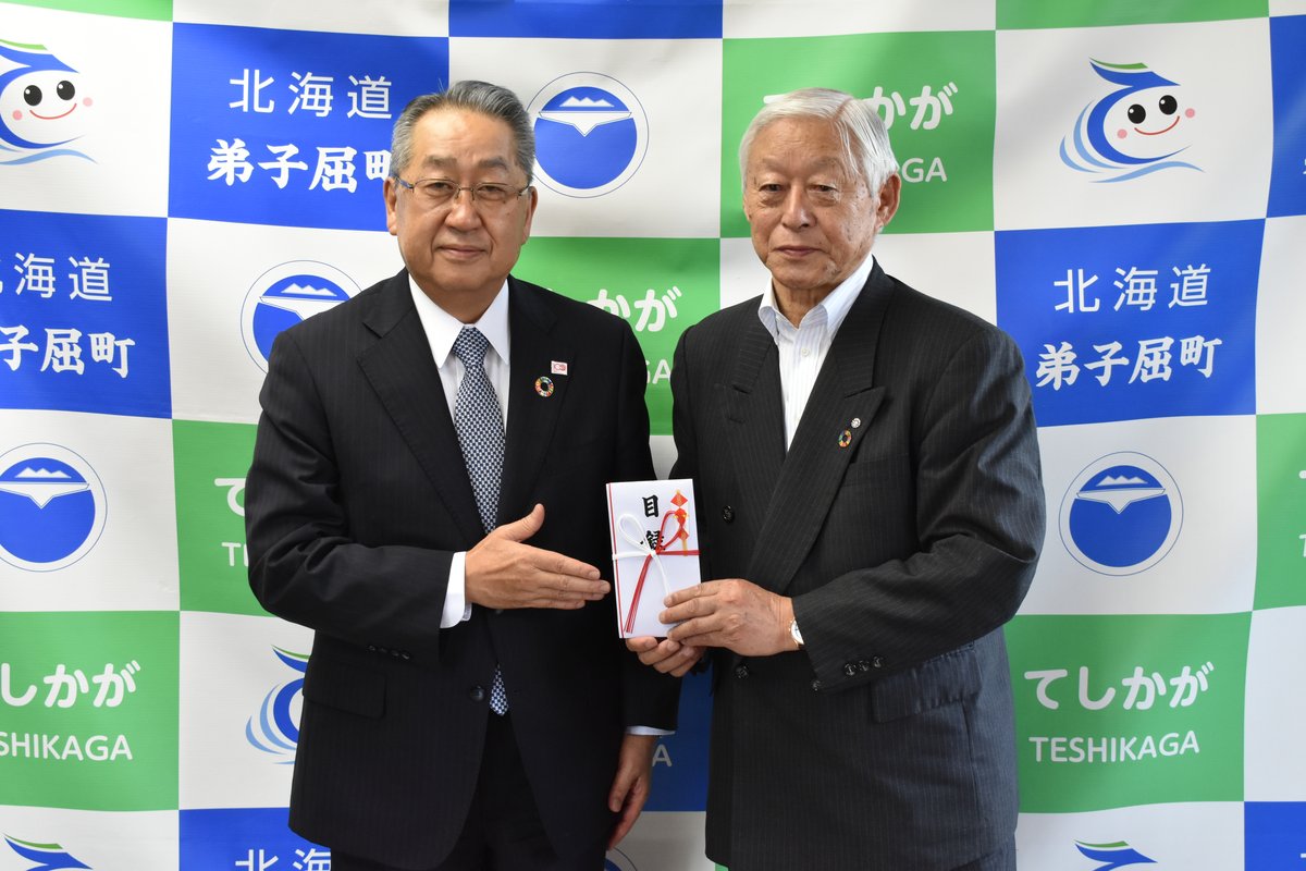 [写真/目録を手に德永町長(右)と森村理事長(弟子屈)]