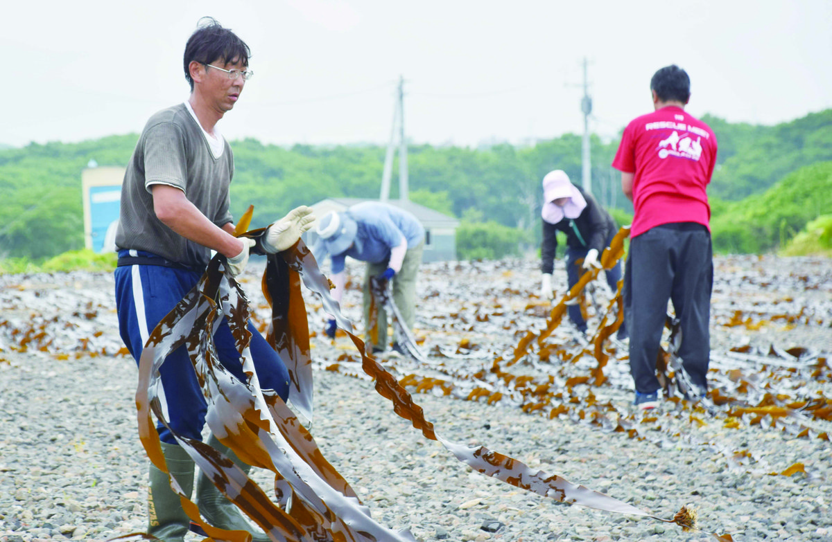 [写真/水揚げしたコンブを干場で干す従事者(2日午前8時45分ごろ、釧路市桂恋)]