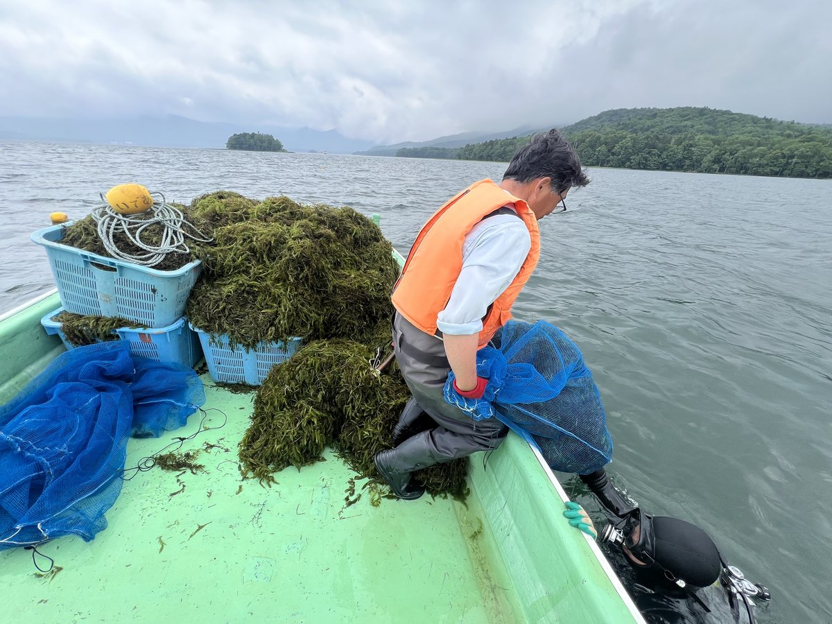 [写真/湖内から採取したマツモを船内に引き上げるダイバーら]