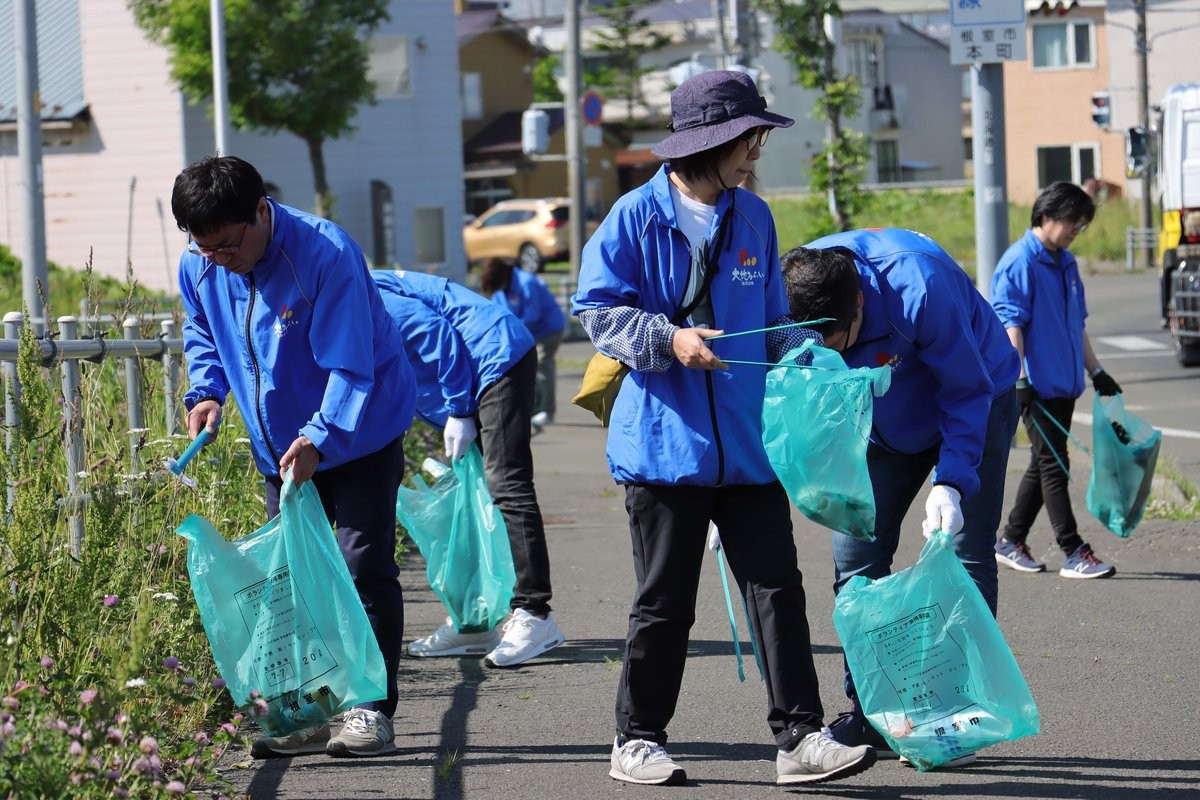 [写真/ごみを拾い集める大地みらい信金職員]