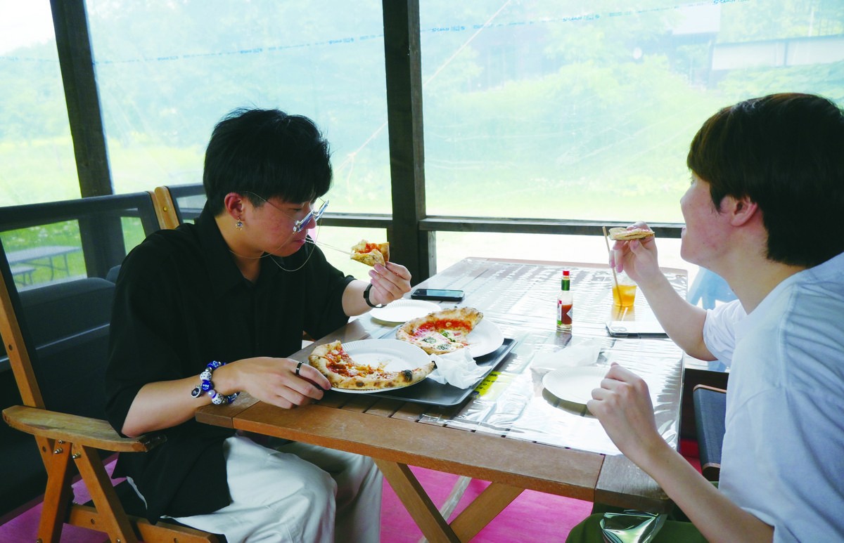 [写真/焼きたてのピザに舌鼓を打つ来場者]