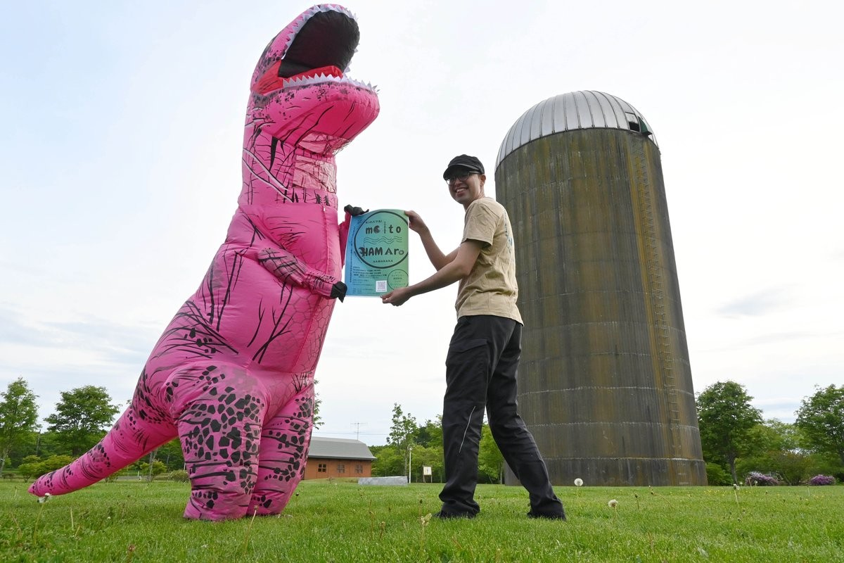 [写真/ティラノサウルスも来るよ―。会場でもっとハマろをPRする島﨑さん(右)]