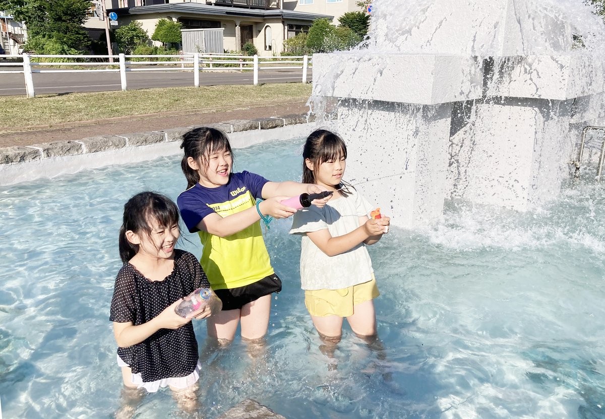 [写真/水遊びする子供たち(22日午後4時15分ごろ、釧路市柳町公園内噴水)]