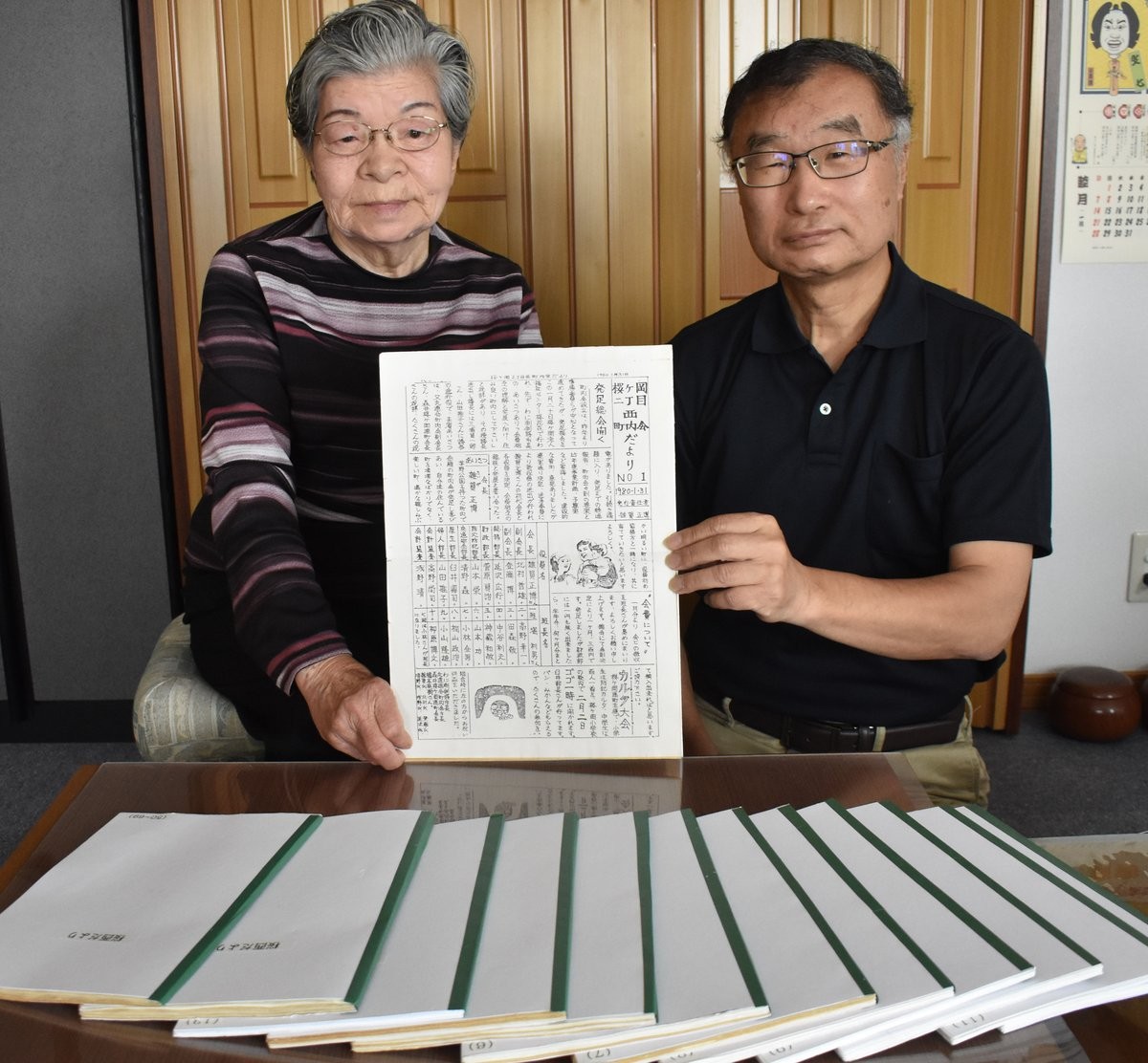 [写真/草創期の「桜西だより」を手に延澤さん(左)と福士総務部長]