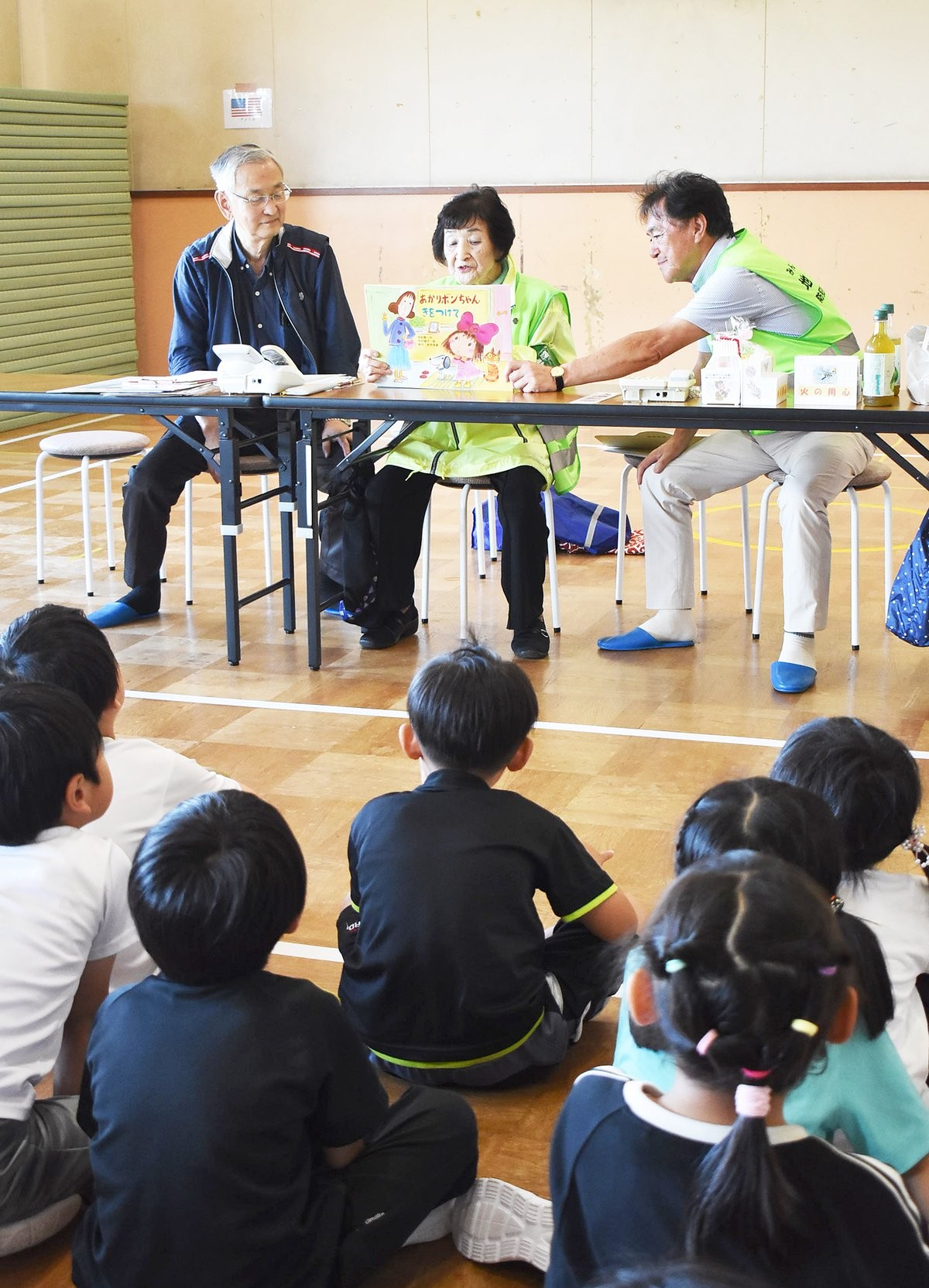 [写真/子供たちに紙芝居を通じて注意を促す推進委員]
