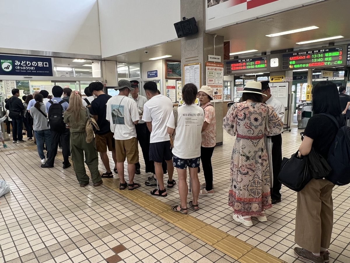 [写真/運休が相次ぎ、混雑するJR釧路駅内]