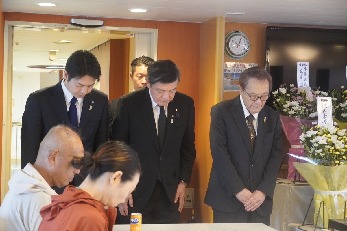 [写真/船内で黙とうを捧げる鈴木知事、伊東北方担当相、松本理事長(左から)=代表撮影]