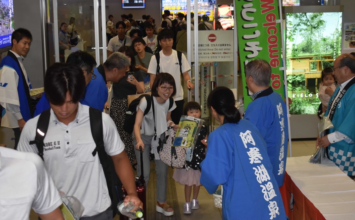 [写真/くしろ広域観光誘致推進協議会のメンバーから歓迎を受ける到着客]