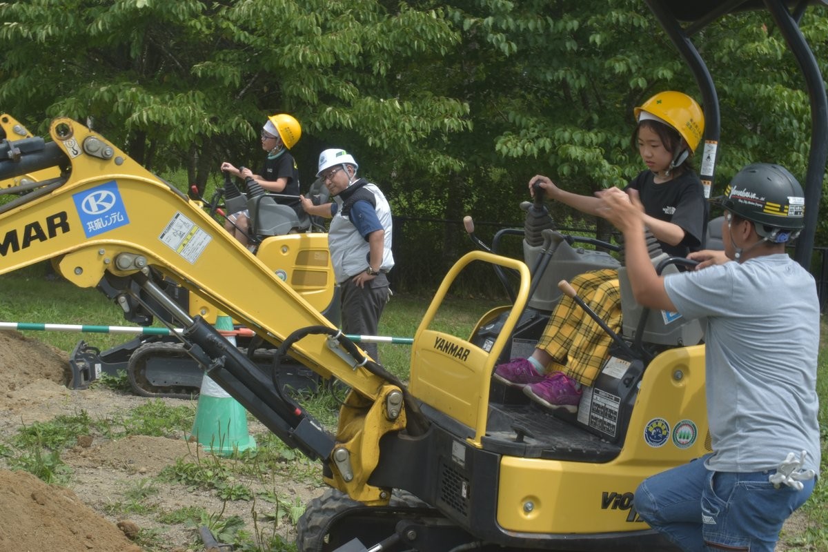 [写真/建設業協会から重機の操作を教わる子供たち]