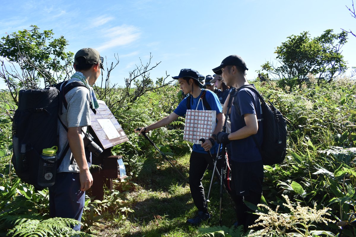 [写真/摩周・屈斜路トレイルの看板を確認する参加者]