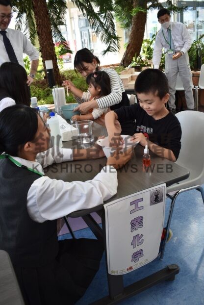 [写真/釧路工業高生のアドバイスを受けてスライム作りを楽しむ子供たち]