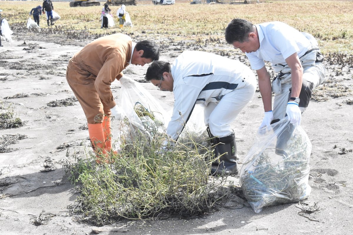 [写真/オニハマダイコンの駆除を行う参加者]