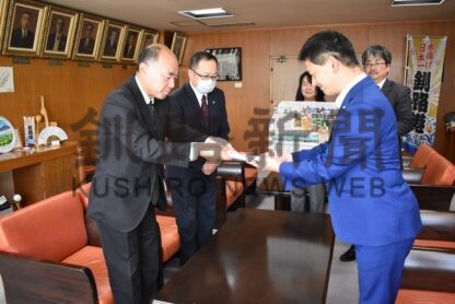 [写真/寄付金の目録を鶴間市長に手渡す星社長(左)]