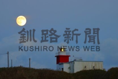 [写真/花咲灯台を照らす「中秋の名月」(午後5時ごろ根室市花咲港、成田友美通信員撮影)]