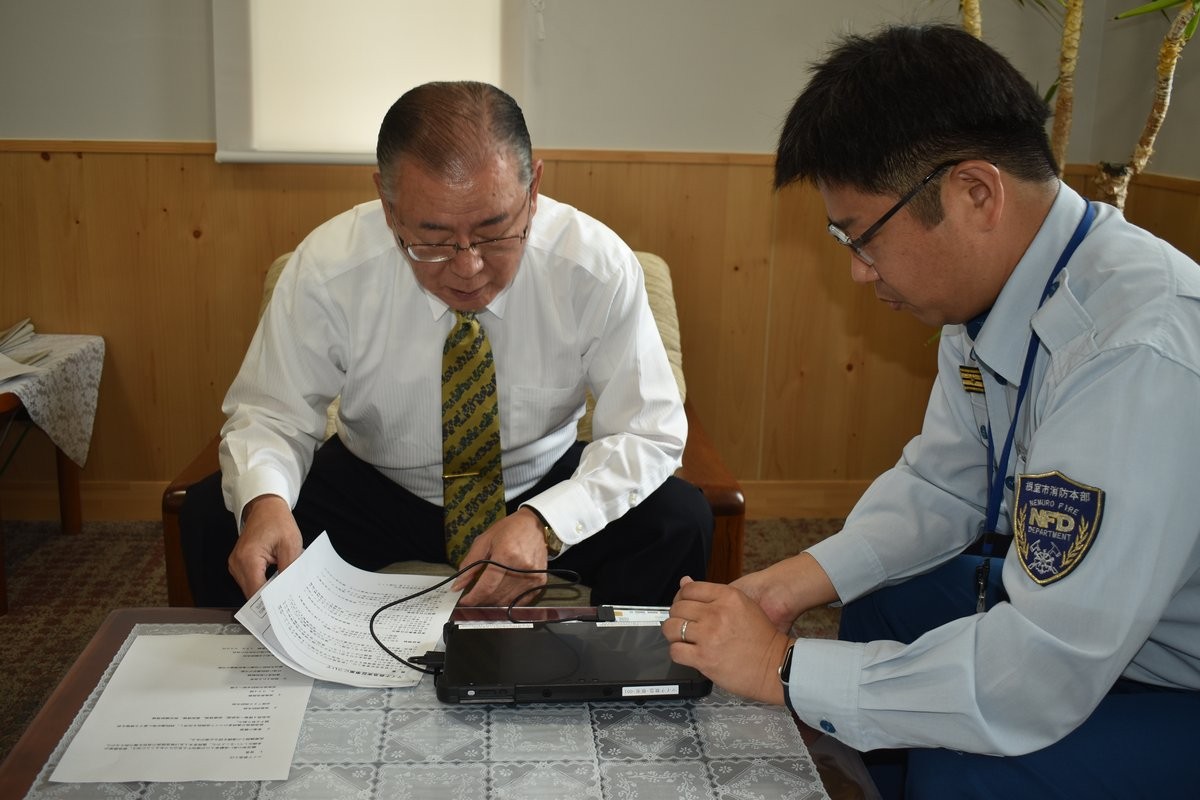 [写真/市消防本部から説明を受ける石垣市長]