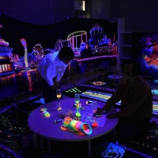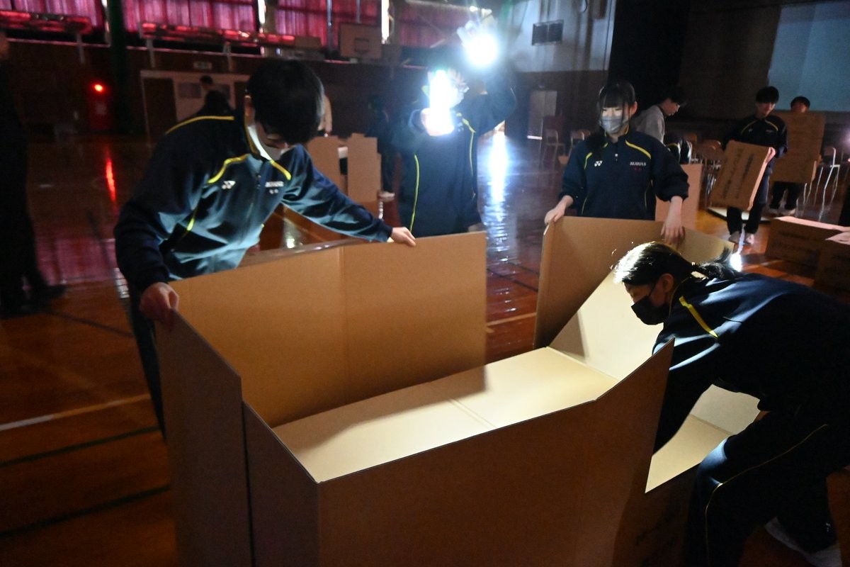 [写真/暗闇の中でライトを照らし、段ボールベッドの組み立てに挑戦する生徒ら]