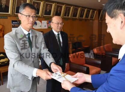 [写真/㊨鶴間市長(右)に目録を手渡す荒井会長(左)と横田幹事㊦JR東釧路駅横の駐輪場に設置された防犯灯]