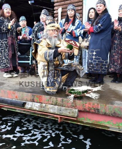 [写真/歌声に包まれる中、マリモを湖に返す西田代表理事(中央)]
