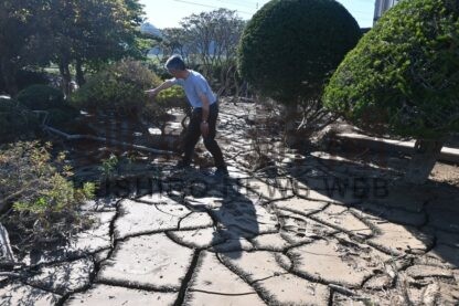 [写真/大雨により、地盤がひび割れした高田さん宅の敷地内]