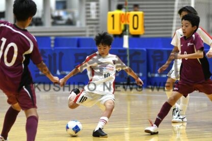[写真/決勝の前半に連続ゴールを決めたコンサドーレ釧路U─12の吉田(中央)]