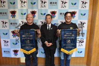 [写真/佐藤町長(中央)と一緒に、バナーを手に笑顔を見せる松本さん(右)と佐藤さん]