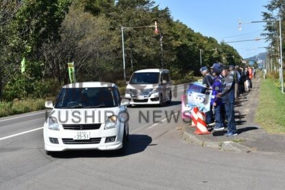 [写真/国道沿いで旗を振る参加者と、釧路圏摩周観光文化センターに誘導される通行車両]