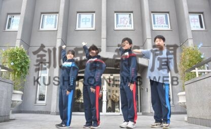 [写真/職員玄関上に掲示された応援メッセージをアピールする生徒会のメンバー]