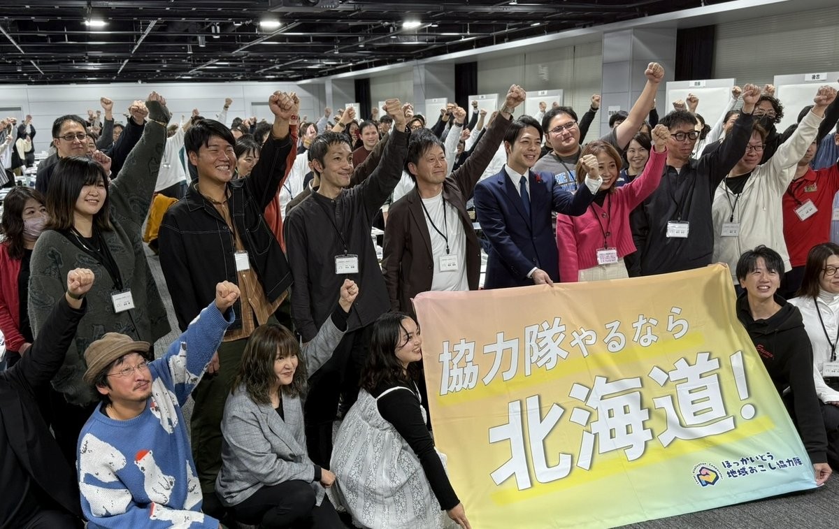 [写真/全道から集まった127人が鈴木知事と一緒に「協力隊やるなら北海道」とアピール]