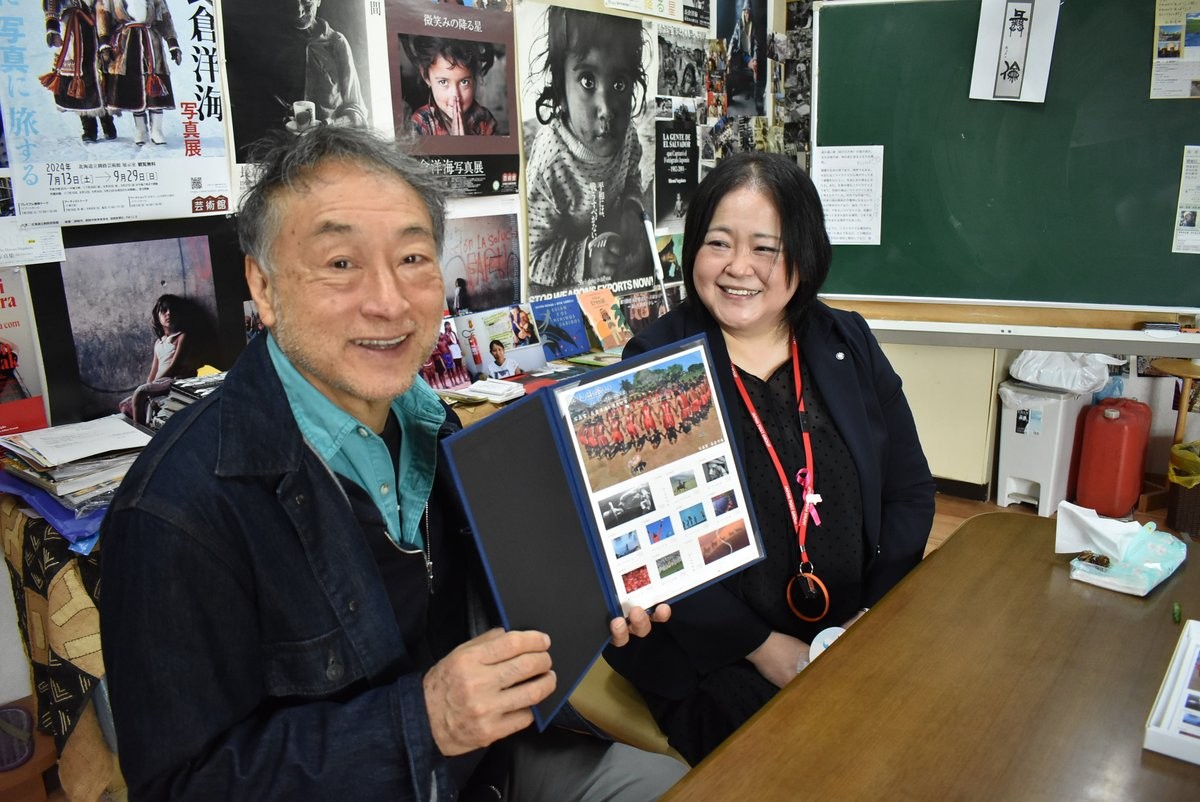 [写真/念願の切手を手にする長倉さん(左)と麻生局長]