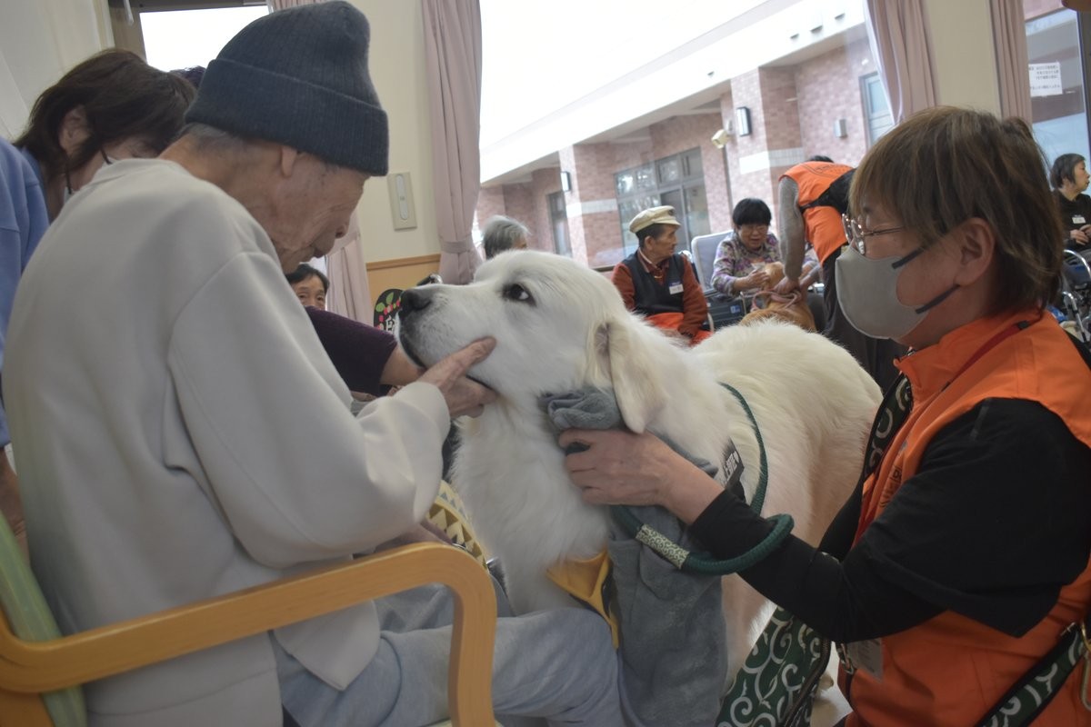 [写真/地元デビューで利用者と交流するセラピードッグの「師匠」]