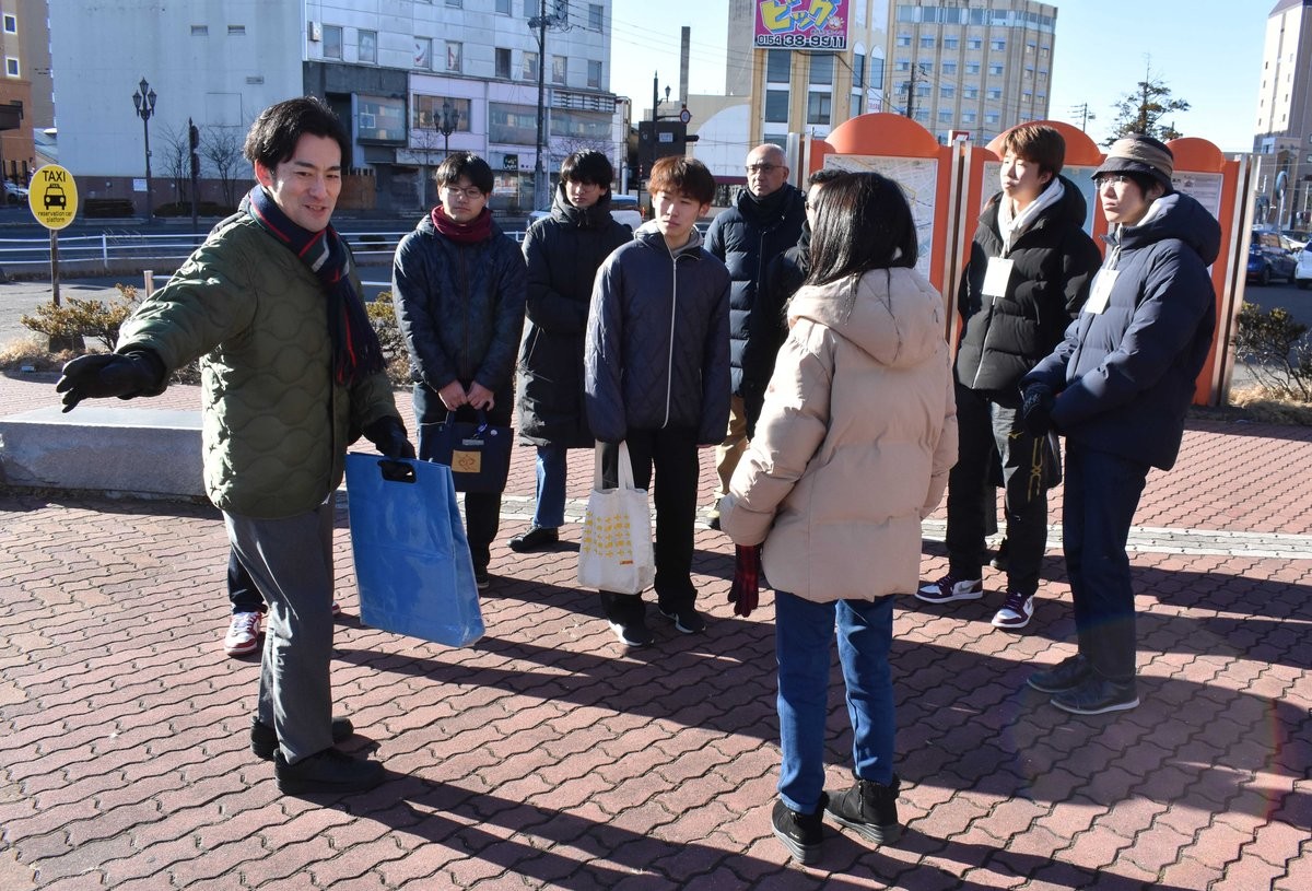 [写真/JR釧路駅前で市都心部まちづくり推進室の山下さん(左端)から説明を受ける参加者]