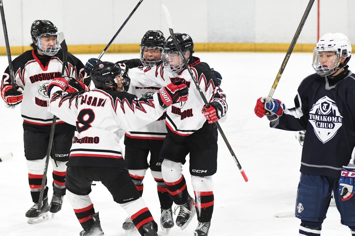 [写真/【準決勝、武修館─苫小牧中央】第2ピリオド17分に勝ち越しゴールを決めた武修館のFW池上(右から2人目)=佐々木美香撮影]