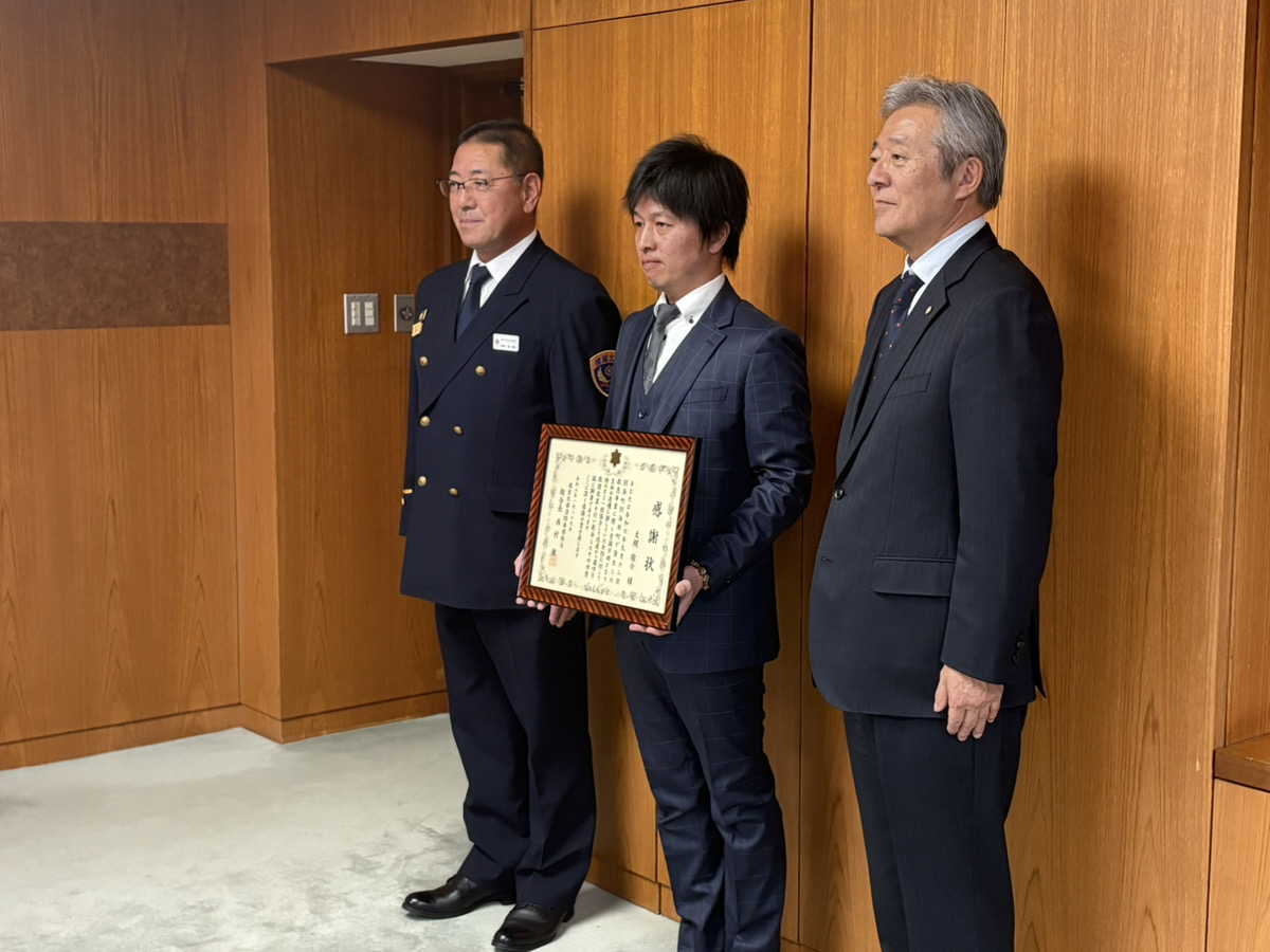 [写真/人命救助で感謝状を受け取った大槻さん(中央)]
