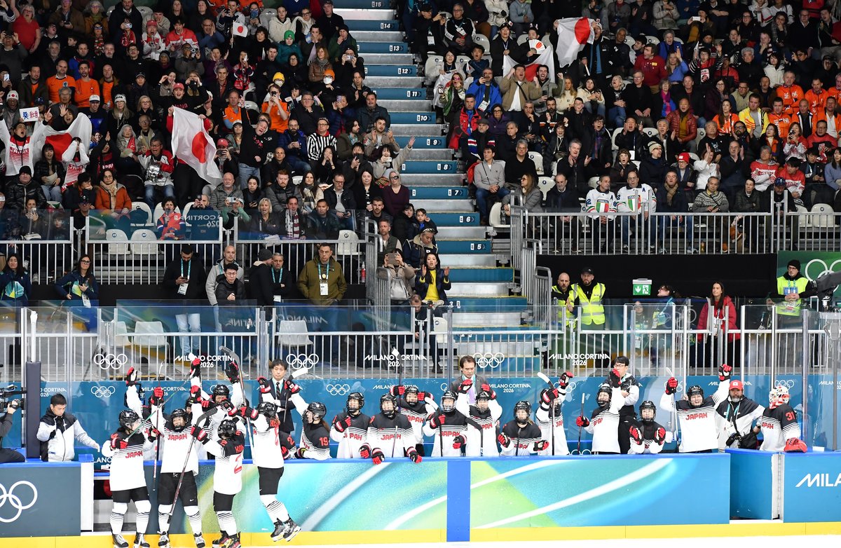 [写真/【イタリア─日本】第3ピリオド11分、ビデオ検証の末にゴール判定となり、沸き立つ日本ベンチと日本人の観客]