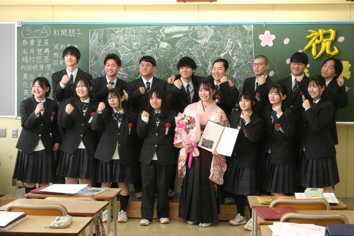 [写真/式終了後、教室で記念撮影をする卒業生ら(白糠高校)]
