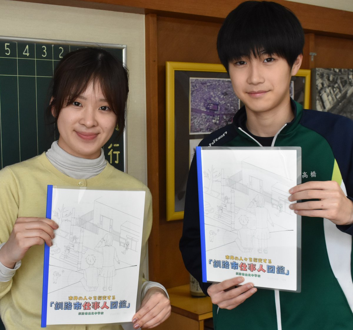 [写真/完成した「釧路市仕事人図鑑」を手に前生徒会長の髙橋さん(右)と山本教諭]