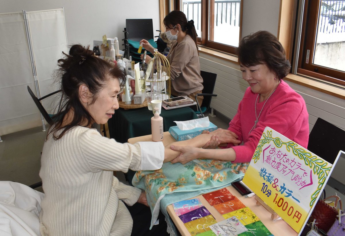 [写真/ハンドトリートメントを楽しむ来場者(左)]