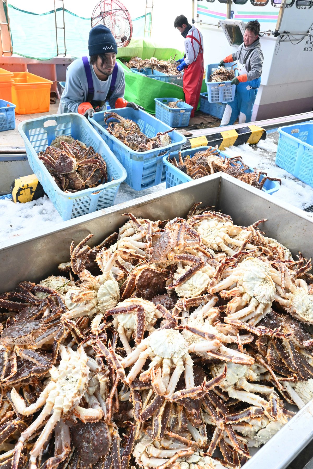 [写真/まとまった水揚げが続くタラバガニ(3月10日午前9時30分ごろ、厚岸港)]