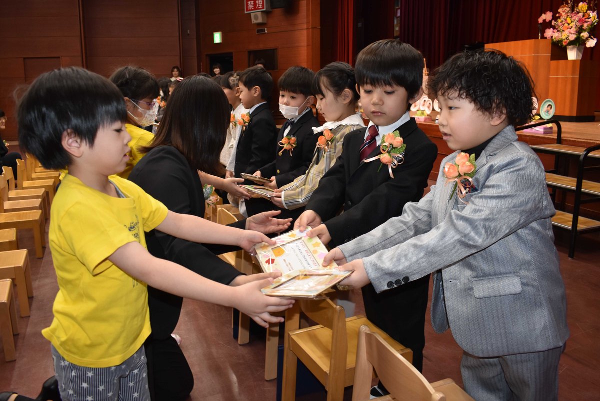 [写真/在園児(左)からお祝いの品を受け取る卒園児たち(18日、釧路あさひ認定こども園)]