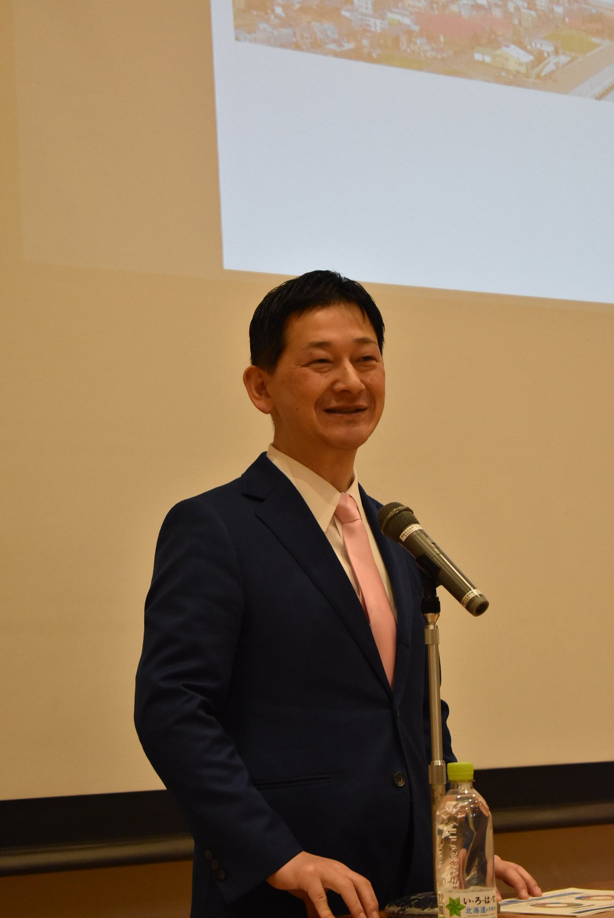 [写真/市政運営をテーマに講演する鶴間市長]