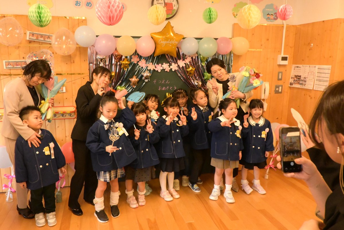 [写真/フォトブースで担当教諭らと記念撮影をする卒園生たち(庶路こども園)]