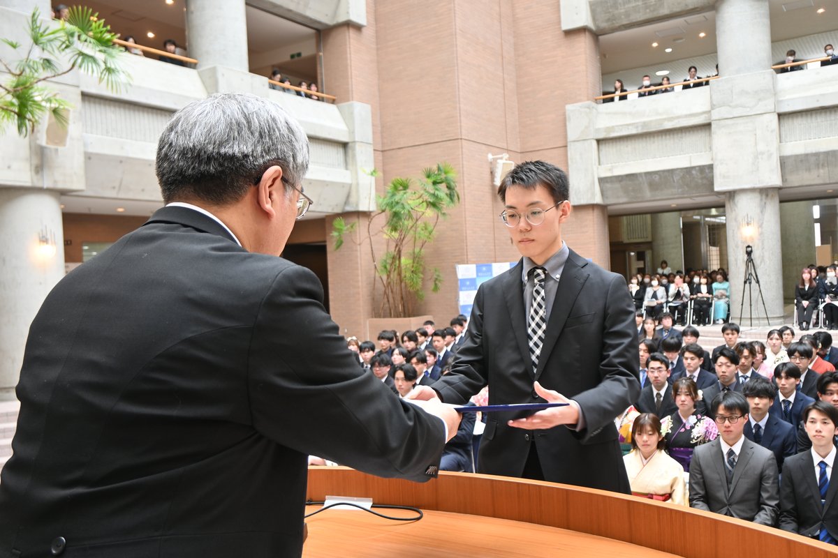 [写真/白川学長(手前)から学位記を受け取る卒業生]