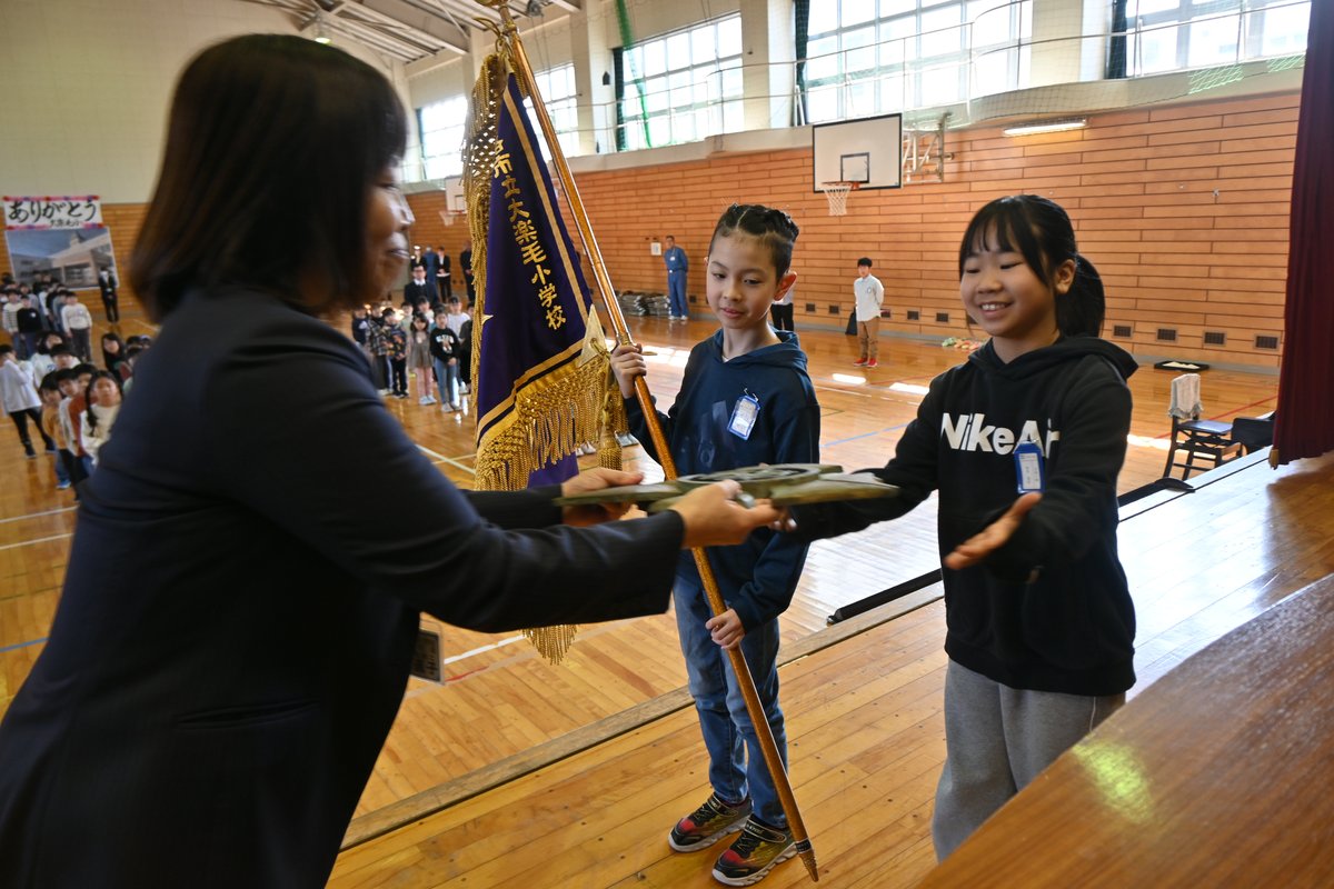 [写真/冨田校長(左)から校旗と校章を受け取る児童ら(釧路市立大楽毛小学校)]