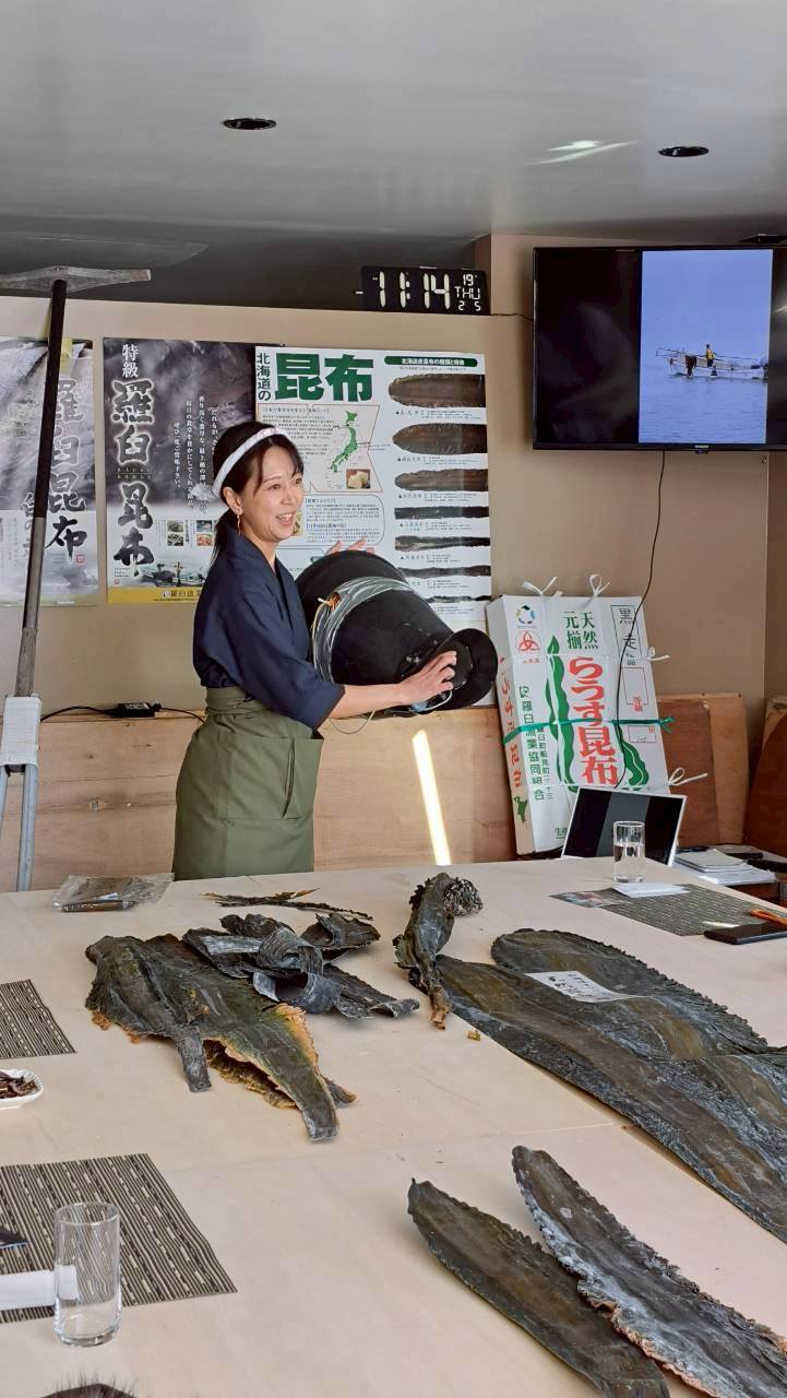 [写真/羅臼昆布職人体験でコンブについて解説する加瀬さん]