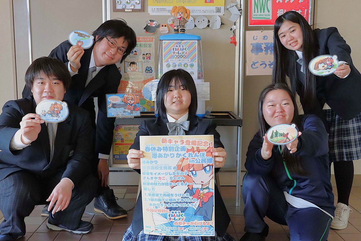 [写真/かくれんぼをPRする根室高2年生5人。特別企画としてねむろわんぱくチャレンジのガチャ1回にも挑戦できる]