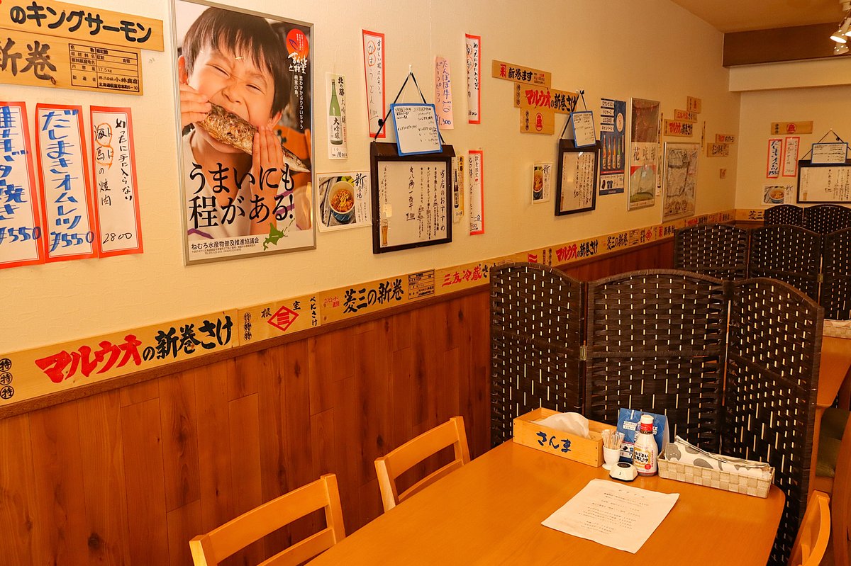 [写真/地元の味を伝えるメニューやポスターが並ぶ店内。魚種や屋号が記された「魚箱」の板が港町らしさを感じさせる]