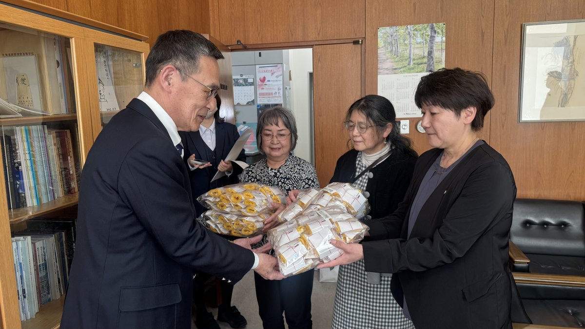 [写真/山田教育長に愛の鈴を手渡した中標津町商工会女性部]