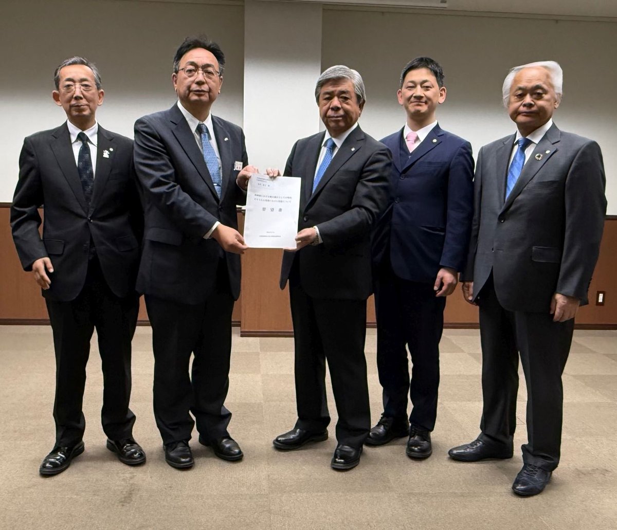 [写真/綿貫社長(左から2人目)に要請した棚野会長ら期成会の4首長]