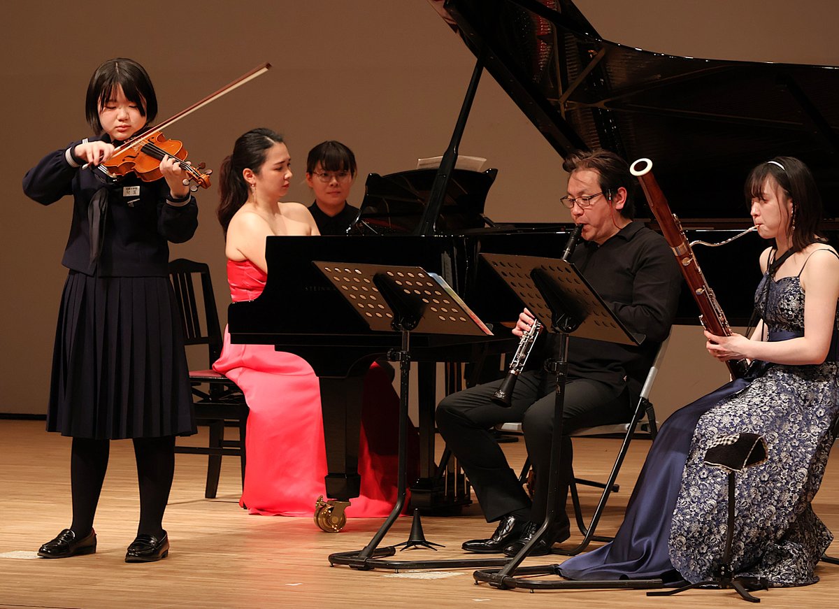 [写真/ピアノを演奏する荒川さん(左から2番目)と共演するプロ演奏家ら]